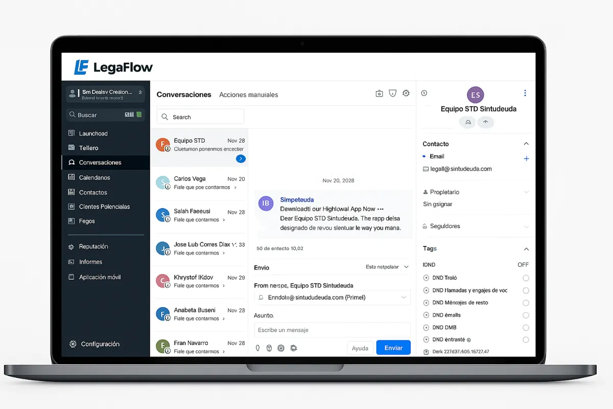 LegaFlow combina campañas automatizadas en Meta Ads junto con un CRM especializado para despachos jurídicos.